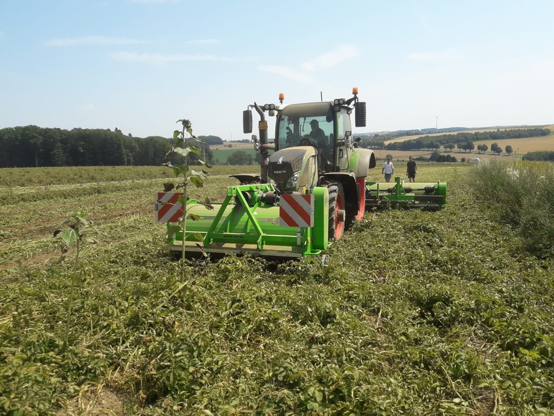 Ein Teil unserer Kartoffelbestände haben beinahe die optimale Erntegrösse erreicht. Damit die Knollen nicht zu gross werden muss das Kartoffelkraut reguliert bzw. abgetötet werden. Um dabei auf den Einsatz von Pflanzenschutzmitteln zu verzichten, haben wir heute einen sechsreihigen Krautschläger der Firma AVR testen dürfen. Durch die mechanische Krautabtötung kann einige Wochen vor der Ernte eine gleichmäßige Ausreifung und die Schalenfestigkeit der Kartoffeln sichergestellt werden.