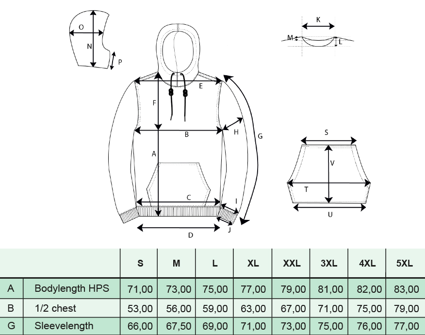 Kapuzenpullover mit Halbmond im Nacken. Gerippte 2x2 Bündchen an den Ärmeln sowie am Saumende. Kordelstopper in Kontrastfarbe.