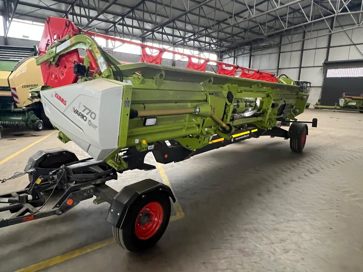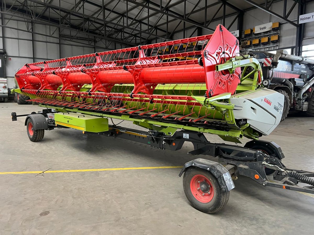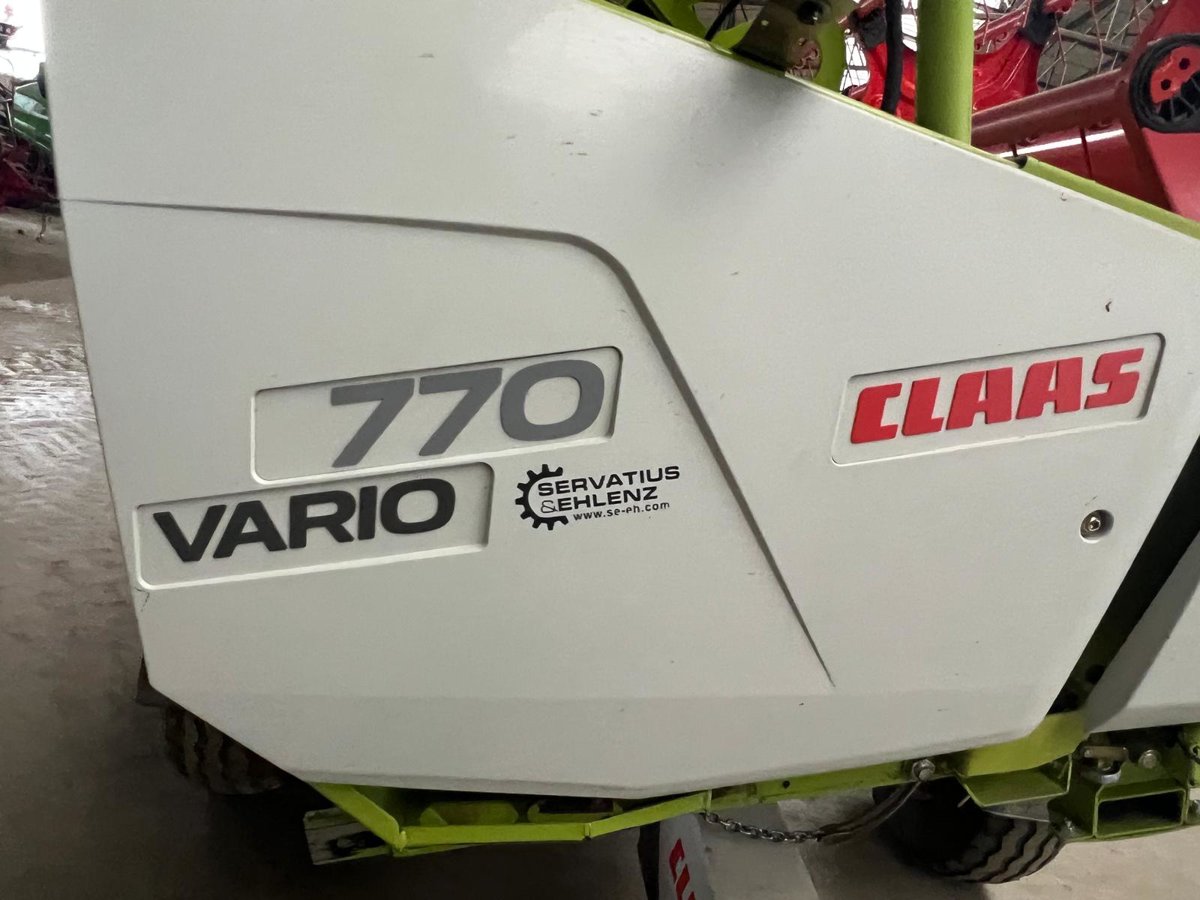 Zur Maschine gehört ein Schneidwerk Vario 770 mit AUTO CONTOUR Schneidwerksführung (6 Taster), Lichtpaket LED, Steinabweisblech 7,70 m und der Gelenkwelle MONTANA.