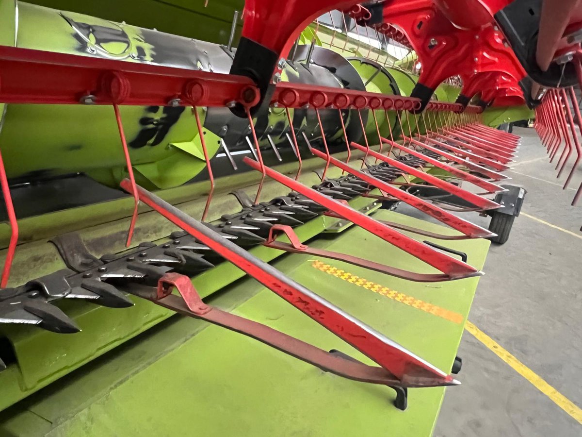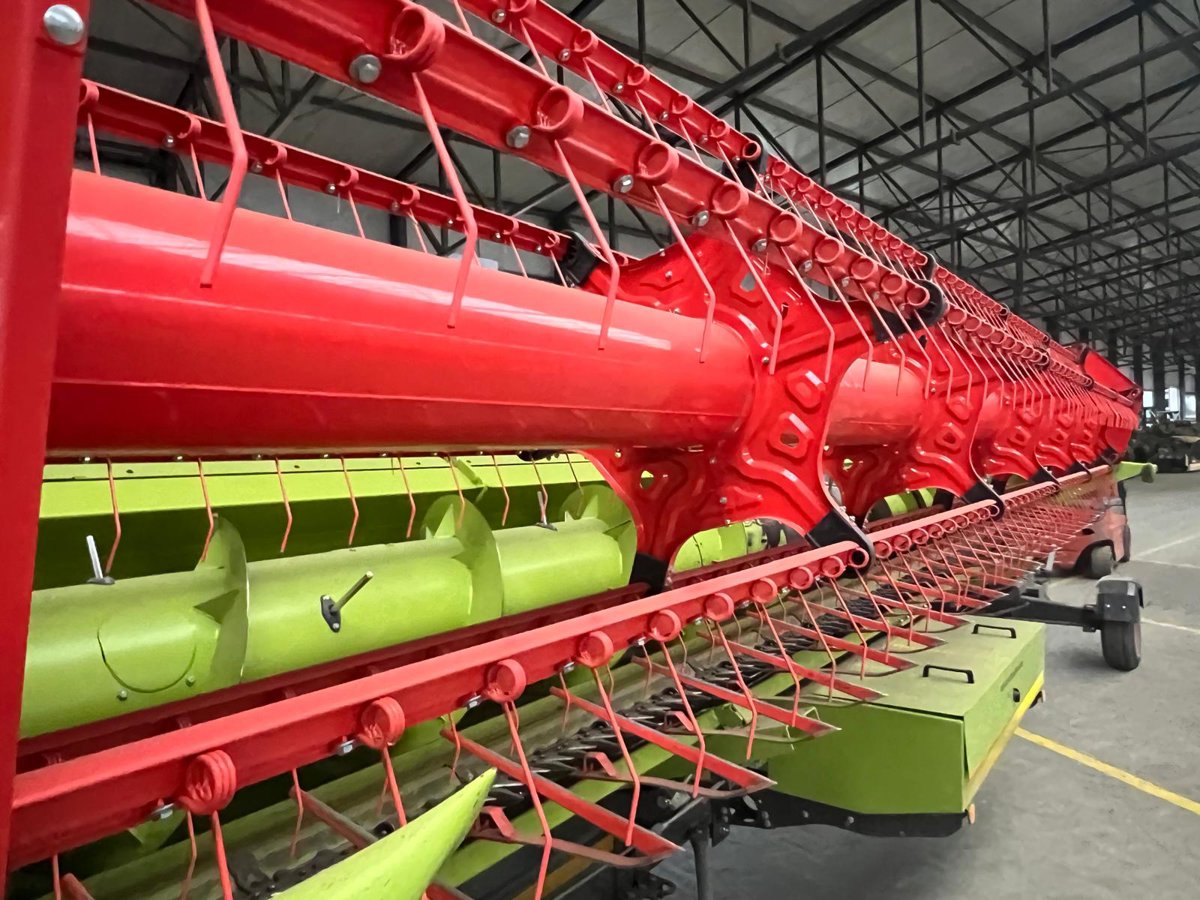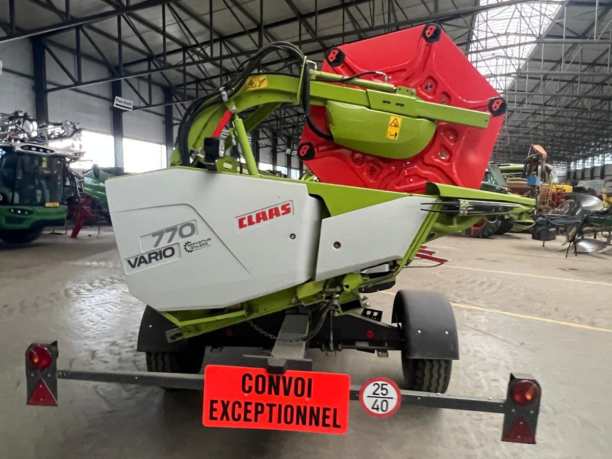 Zur Maschine gehört ein Schneidwerk Vario 770 mit AUTO CONTOUR Schneidwerksführung (6 Taster), Lichtpaket LED, Steinabweisblech 7,70 m und der Gelenkwelle MONTANA.
